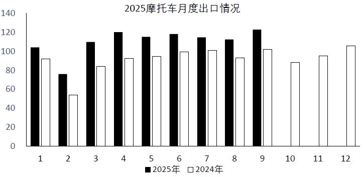 9 月,我国摩托车外贸出口环比实现恢复性增长,同比则呈现显著增长态势;1-9 月累计出口量始终保持较大幅度的增长势头。